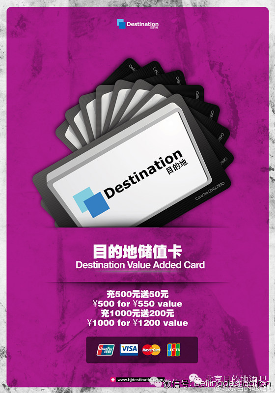 目的地优惠◆酒吧全年无休!除周五周六和特殊节假日、活动外均免门票!◆目的地储值卡充500元送50元,充100